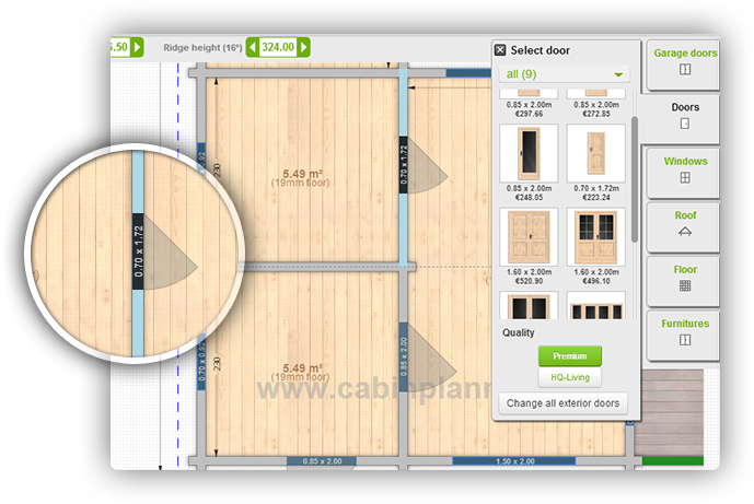 Cabinplanner© provides its user possibility of choosing different types of wood thickness, roof style, windows and doors and many other technical features which makes our configurator very convenient and versatile. Our configurator has user friendly interface and is made for intuitive use.  We constantly work on developing our configurator to offer even more options and possibilities.